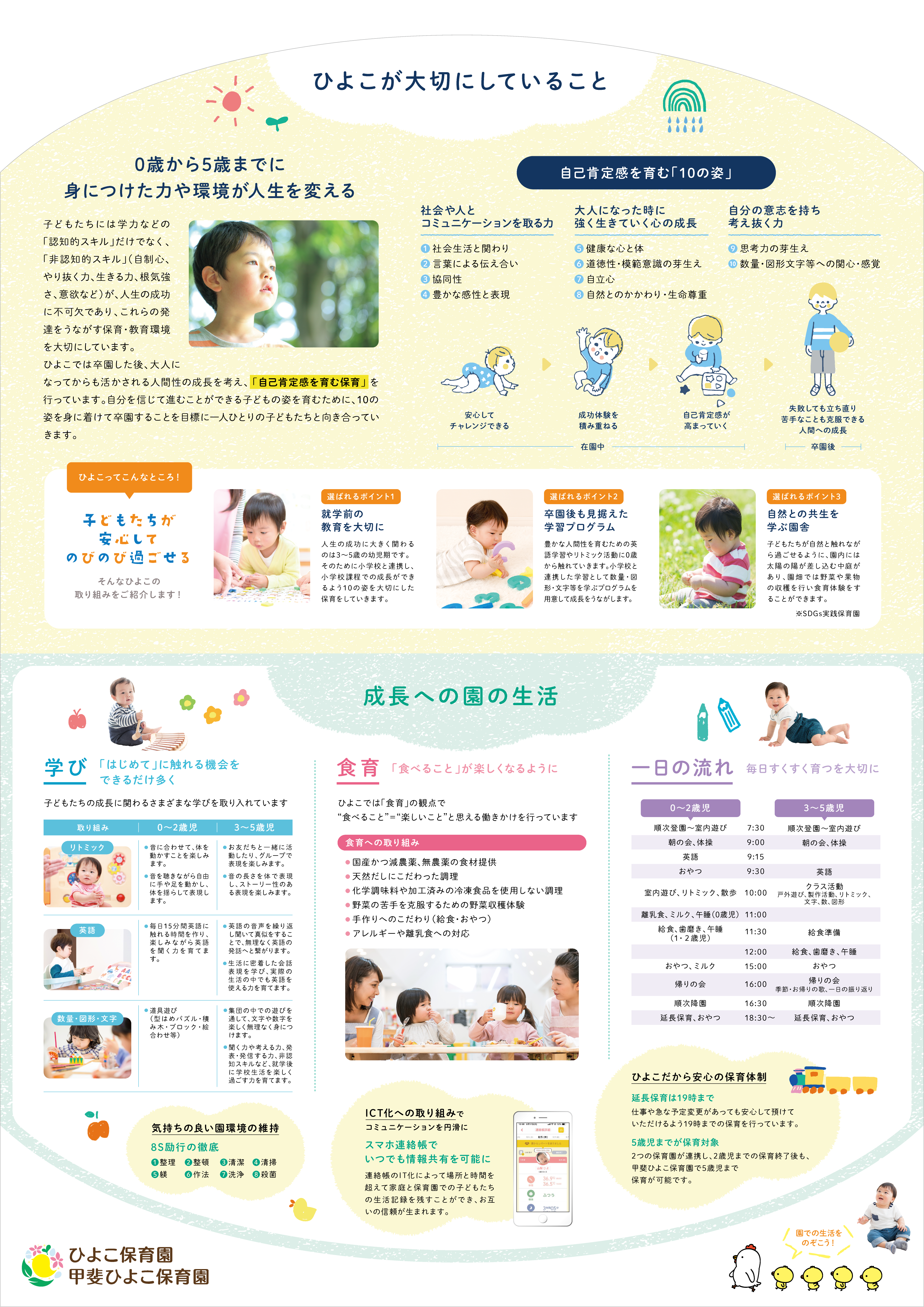 園が大切にしている理念をしっかりと紹介することはもちろん、保護者の方が見たときに、お子様が実際ひよこ保育園に入園するイメージ持って頂けるように「1日の園での生活スケジュール」を具体的にわかりやすく掲載いたしました。